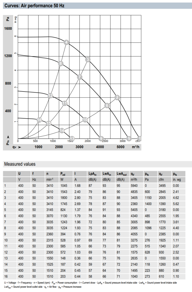 Характеристики производительности центробежного ЕС-вентилятора K3G310PH3832: