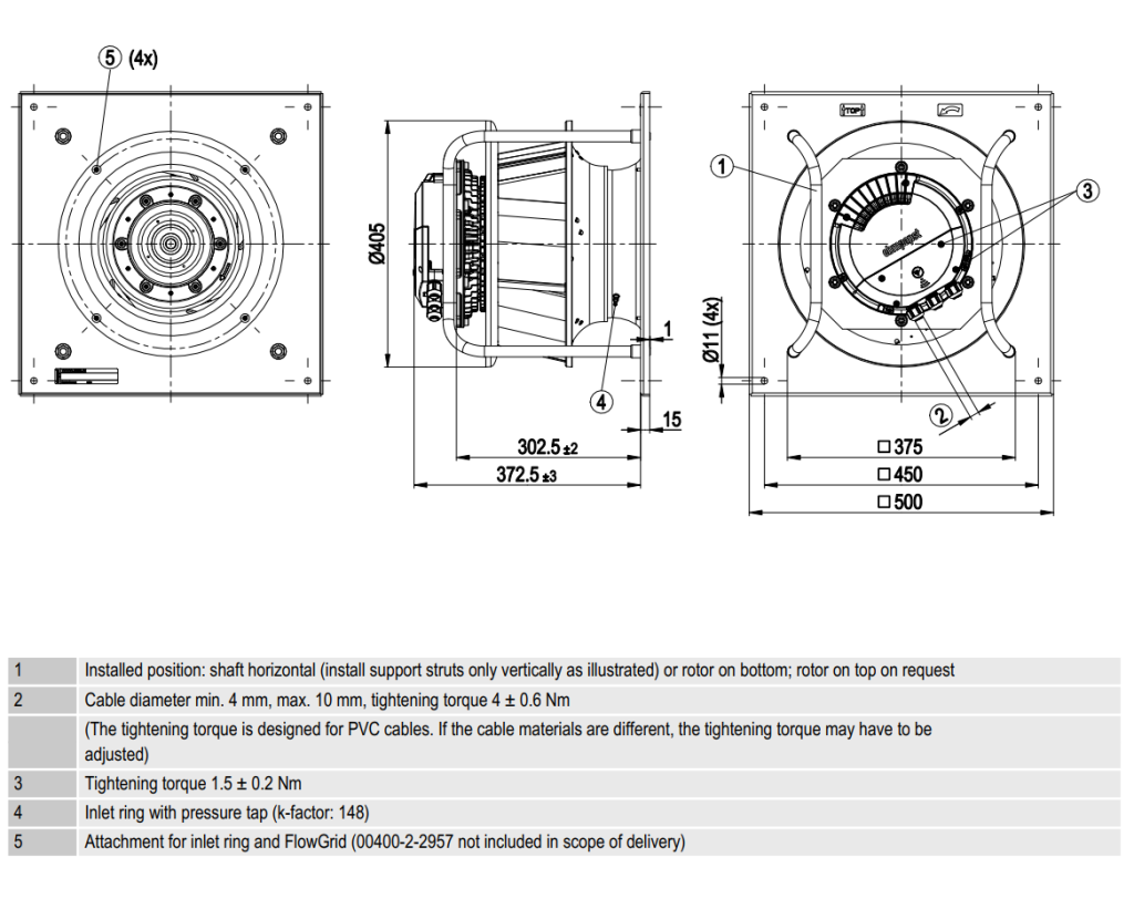 Чертеж центробежного EC-вентилятора RadiPac K3G355-PV70-01/F01: