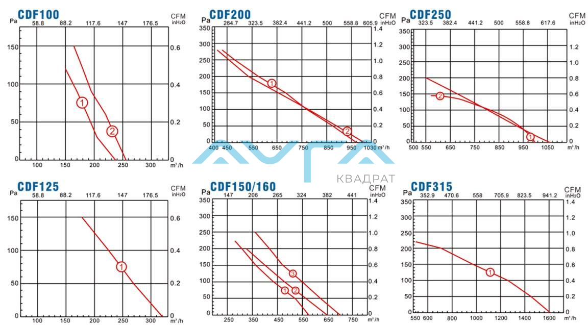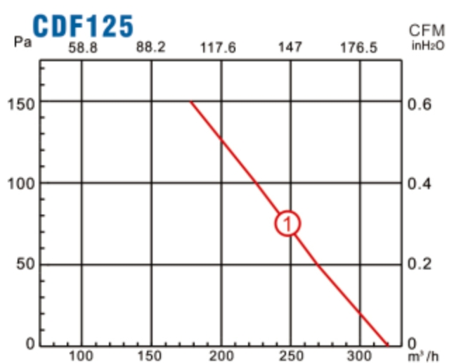 Характеристики производительности канального вентилятора Lionball CDF2E125:
