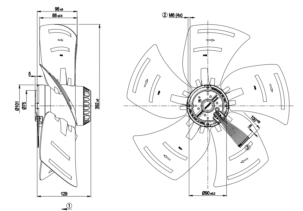 Чертеж и габаритные размеры осевого вентилятора A4D400-AS04-11