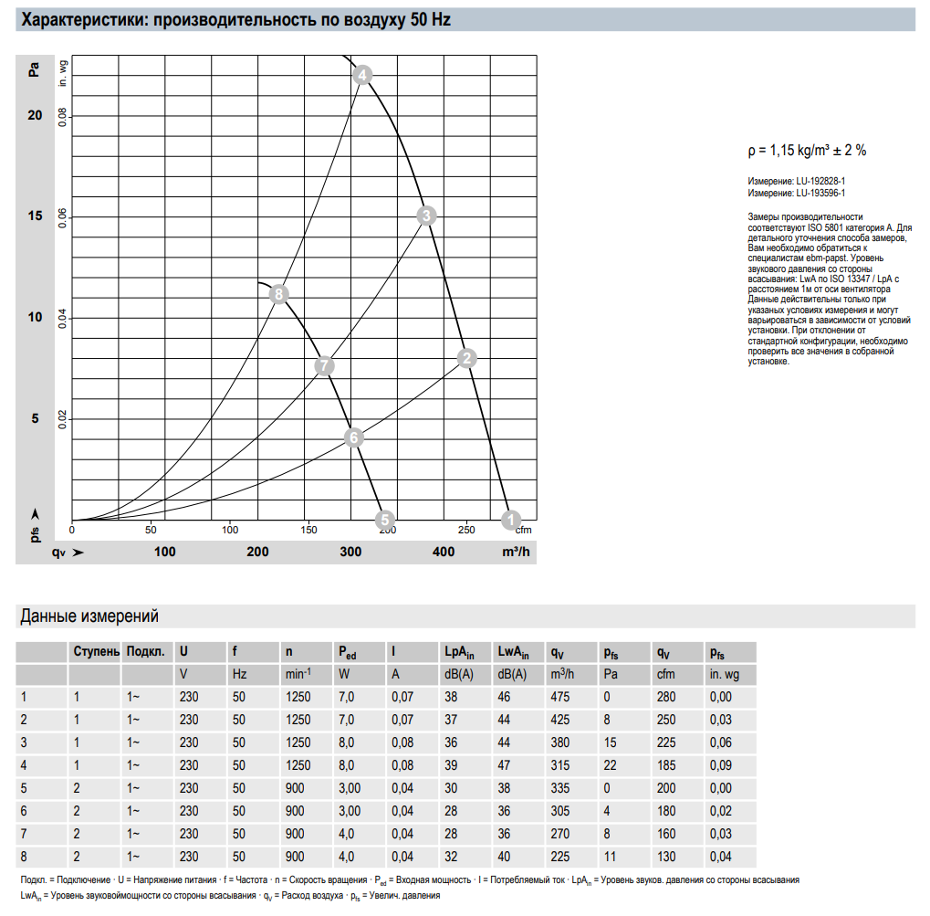 Характеристики производительности осевого ЕС-вентилятора ebmpapst W1G200EG5715: