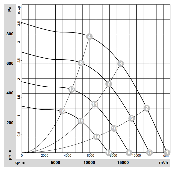 Характеристики производительности центробежного EC-вентилятора RadiCal R3G630FB3203: