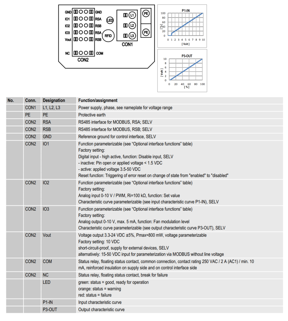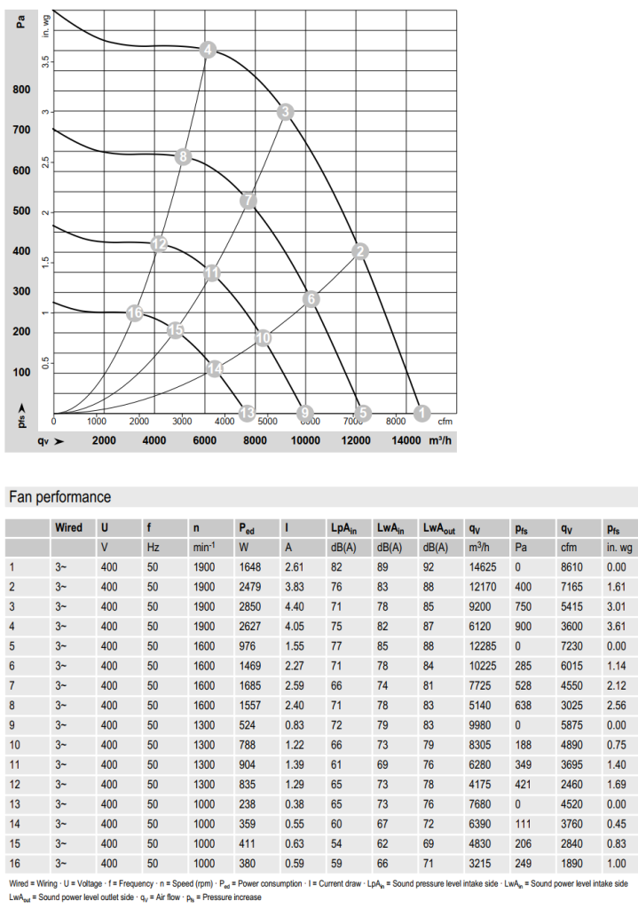 Схема подключения вентилятора K3G500-8317081582:Характеристики производительности по воздуху вентилятора K3G500-8317081582: