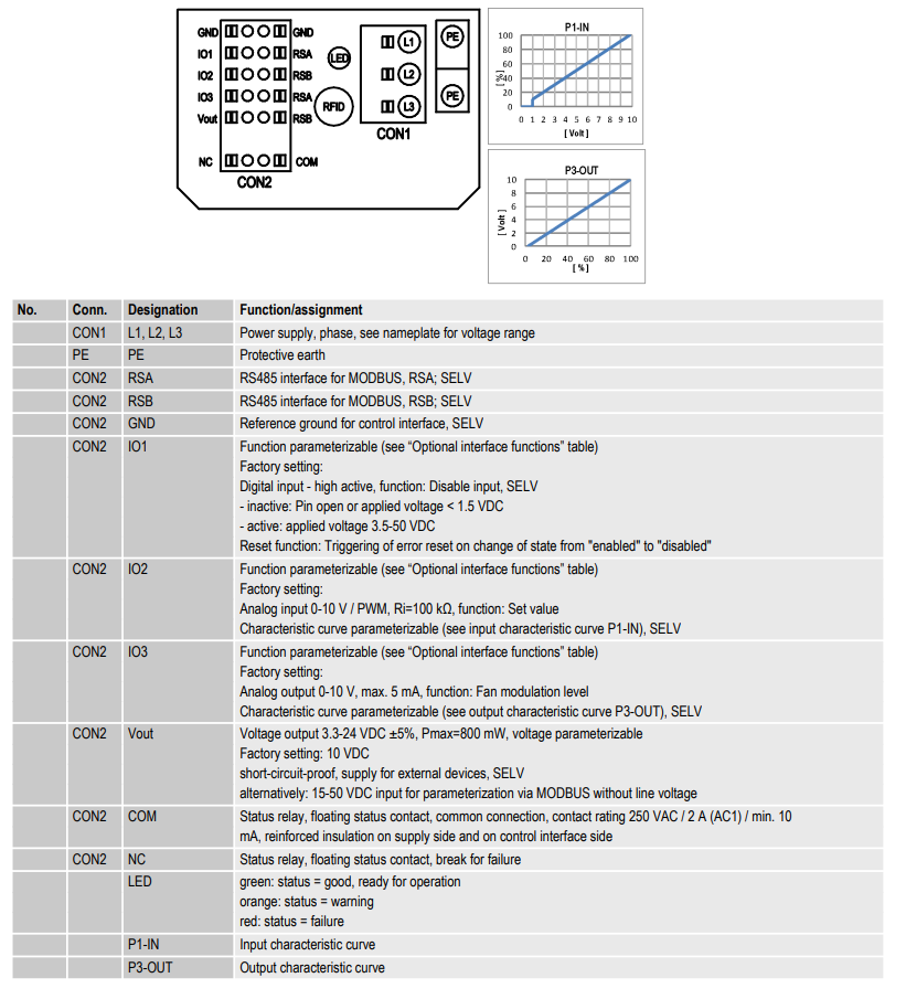 - Управление: аналоговый сигнал 0–10 В, ШИМ (PWM), возможно подключение к системам автоматизации (например, BMS)