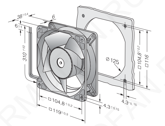 Компактный осевой вентилятор постоянного тока, выпуск воздуха через крепежные поперечины, подключение с помощью одножильных проводов сечением AWG 22 UL 1007, TR 64, корпус с выводом для заземления под винт М4 х 8 (Torx), сигнал контроля скорости, сигнал нормального / ненормального режима работы, внешний/ внутренний датчик температуры, вход для аналогового управляющего сигнала, защита от влаги, степень защиты IP 20/ IP 54. Номинальное напряжение 12 В, воздушный поток 355 м3/час.