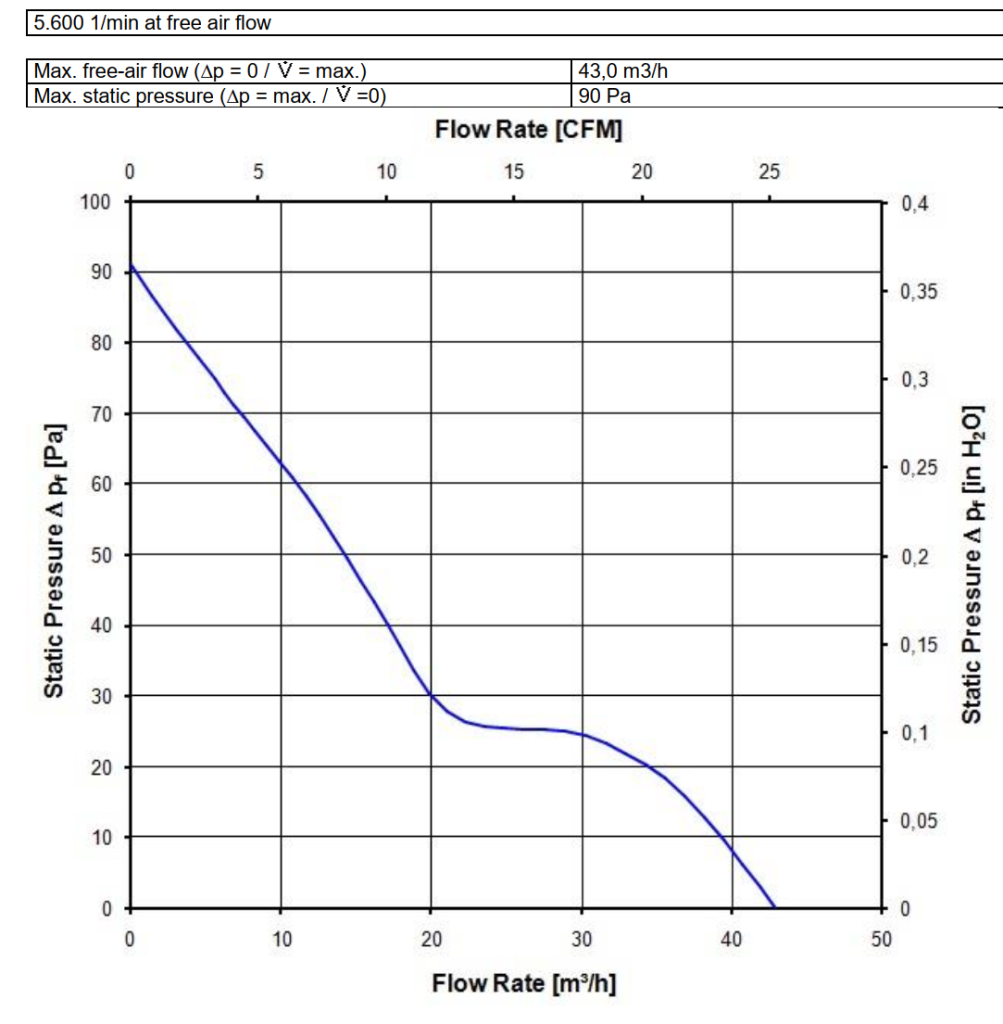 - Максимальный воздушный поток: до 46 м³/ч (≈ 27,1 CFM)