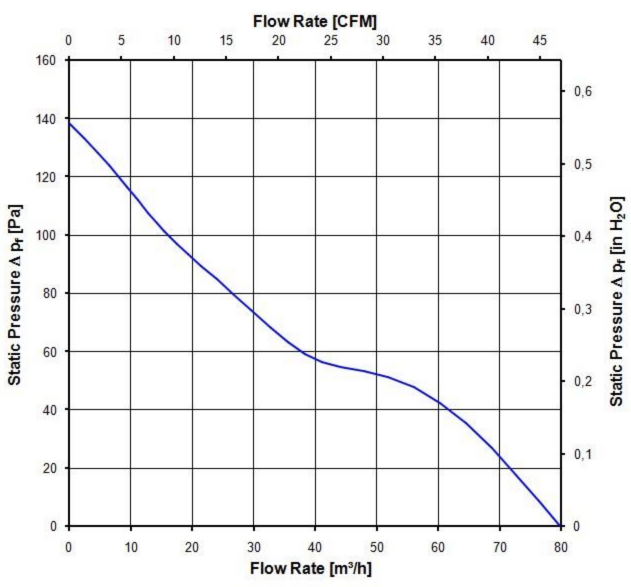 Максимум. свободный поток воздуха (∆p = 0 / V = макс.) 80,0 м3 / ч Максимум. статическое давление (∆p = макс. / V = 0) 138 Па - + UB - красный
