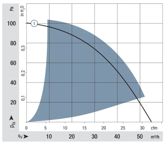 Максимум. свободный поток воздуха (∆p = 0 / V = макс.) 55,0 м3 / ч Максимум. статическое давление (∆p = макс. / V = 0) 100 Па