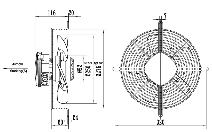 Чертеж осевого вентилятора Weiguang YWF4E-250S-92/25-G: